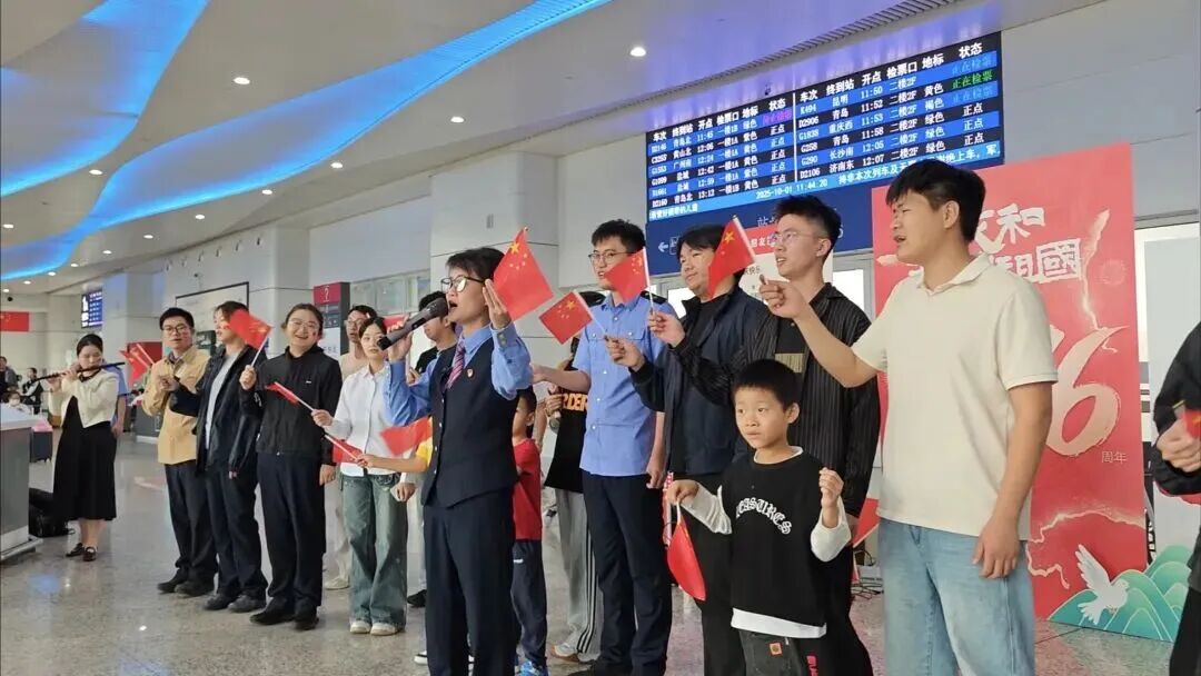 連雲港站候車廳舉行“喜迎國慶 祝福祖國”快閃活動,吸引眾多旅客駐足參與,讓文化創作融入旅途。