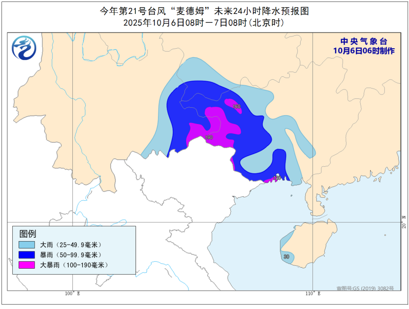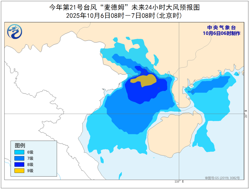 大風預報:10月6日8時至7日8時,南海西北部、北部灣、廣西南部及沿海、廣東西南部沿海、海南島沿海將有6至7級、陣風8至9級的大風,其中,北部灣北部、廣西南部部分沿海風力有8至9級、陣風10至11級。