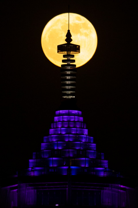 2022年6月14日,江蘇南京大報恩塔與“超級月亮”相映成景。新華社發(蘇陽 攝)
