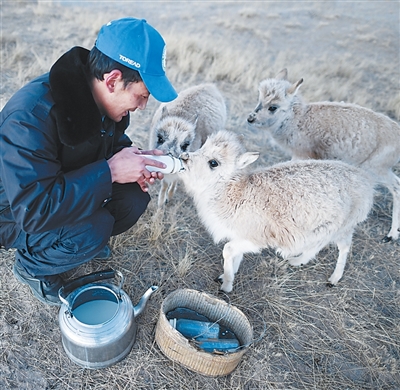 青海三江源國家公園管理局長江源園區可可西里管理處索南達傑保護站,巡山隊員給被救助的藏羚羊幼仔餵奶。