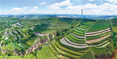 在甘肅定西通渭縣馬營鎮,經過系統治理,黃土高原上的層層梯田風景如畫。
