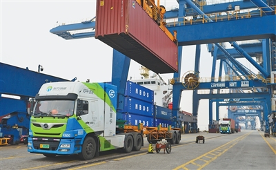 浙江嘉興立足氫能源領域資源優勢,持續拓展氫能示範“應用鏈”。圖為嘉興港乍浦港區,氫能重卡在集裝箱碼頭運輸作業。