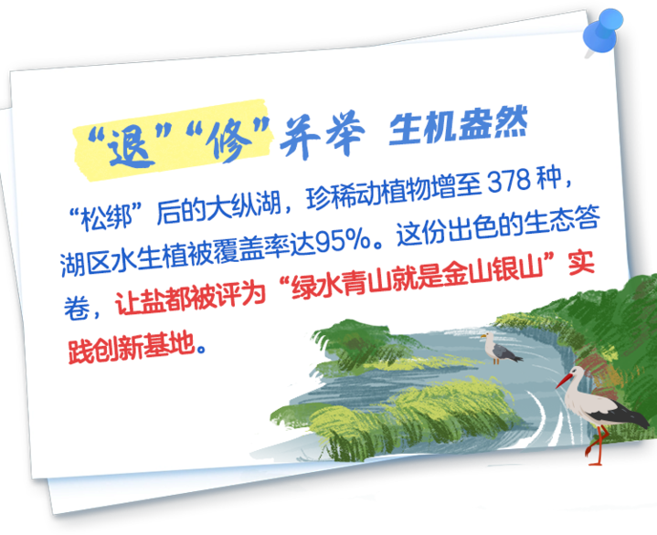 “那會兒河面全是圍網,河道塌坡。尤其到了汛期,河道淤積起來就更難辦,兩岸田地被淹沒,河裏魚蝦也因水質問題大批死亡。”鹽城市鹽都區水利工程建設服務中心技術負責人鄧渤回憶道。“鄉親們靠水吃水,對拆漁網、搞搬遷有一定牴觸。我們和村裏一起給大家算長遠賬:水壞了,魚蝦蟹活不了,靠天吃飯終究不穩。”不少曾經的蟹農,後來成為大縱湖景區的建設者,成了好生態的“合夥人”。説到這裏,鄧渤眼裏有光。