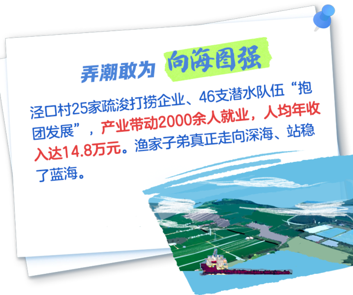 唯有弄潮兒,方能馭海而行。隨着河道治理、航道升級,這支由村民集資組建的隊伍,一步步“遊”出村莊,成長為馳騁深海的“蛟龍艦隊”。涇口村也從昔日的“窮漁村”,華麗蜕變為榮獲全國文明村等五項國家級榮譽的現代化新農村。