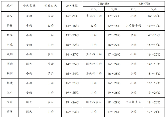 今天晚上:陝北北部有中到大雨(10-30mm),陝北南部、關中大部、陝南東部有分散性小雨或陣雨(0.1-10mm),秦嶺山區部分、陝南西部有小到中雨(5-15mm),局地(寧強縣、洋縣、佛坪縣、勉縣)大到暴雨(15-50mm)。關中西部、陝北西部、秦巴山區有霧。