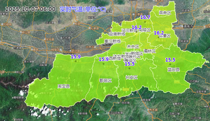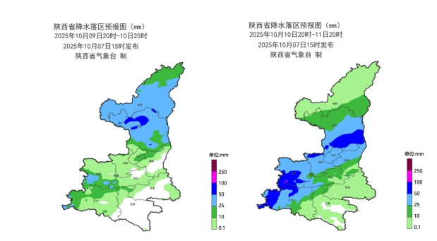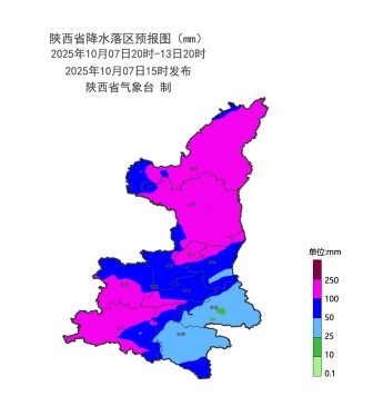 *10月08日20時-10月09日20時:*陝北中北部有中到大雨(10-50mm),其中榆林東部、延安北部局地有暴雨(50-100mm)。延安南部、關中大部、陝南大部有小雨或陣雨(0.1-10mm),關中西部局地、漢中西部局地有中雨(10-25mm)。陝北、關中北部、秦嶺山區有4-5級(5.5-10.7m/s)偏南風,陣風6級(10.8m/s)以上。