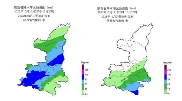 *10月09日20時-10月10日20時:*陝北有中到大雨(10-50mm),其中榆林南部局地、延安北部有暴雨(50-100mm)。關中大部、陝南大部有小雨或陣雨(0.1-10mm),關中北部及西部部分、陝南西部部分、秦巴山區部分地方有中到大雨(10-40mm)。