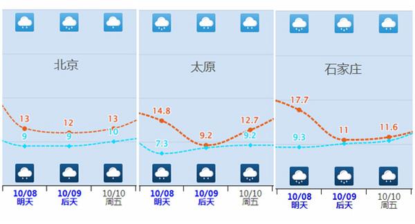 大城市當中,像太原、北京、天津、石家莊9日最高氣温都只有10℃上下,較常年同期偏低10℃左右。