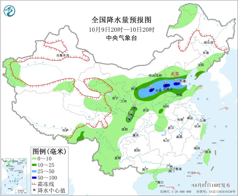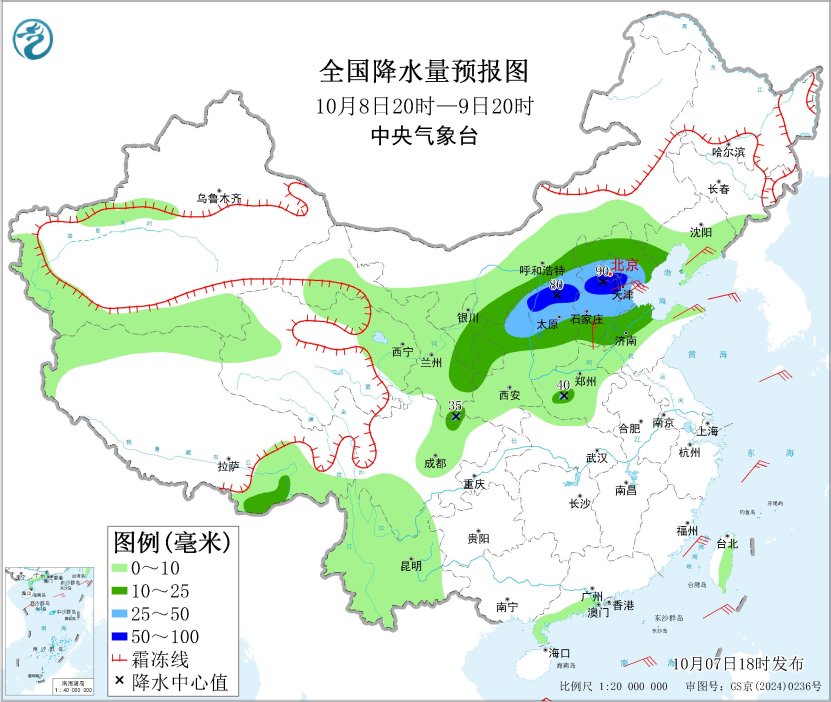 *10月8日20時至9日20時,*內蒙古河套地區、甘肅東部、寧夏中南部、陝西北部、華北大部、山東北部等地部分地區有中到大雨,其中,陝西北部、山西北部、河北中部、北京南部、天津西部等地部分地區有暴雨(50~90毫米)。遼東半島、河北南部、天津東部、山東半島等地部分地區有4~5級風(見圖2)。渤海、東海北部海域、台灣海峽將有6~7級、陣風8級的大風。