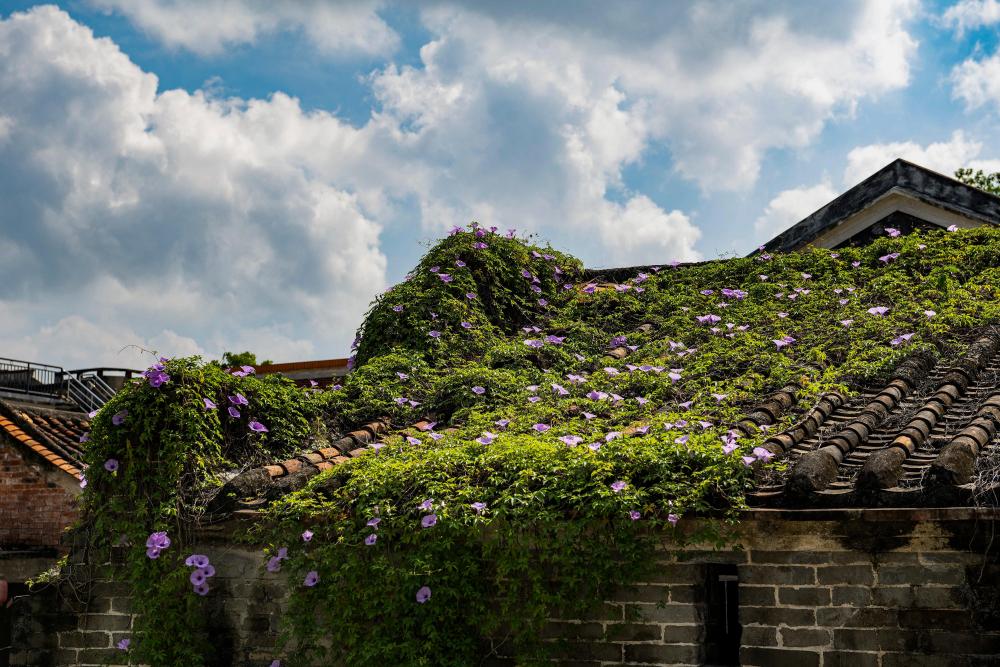 塱頭村內一古屋頂上爬滿植物(9月13日攝)。