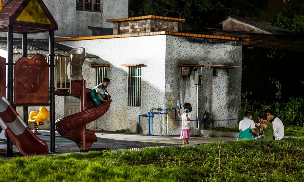 9月12日,孩子們在塱頭村新村的公共遊樂設施玩耍。