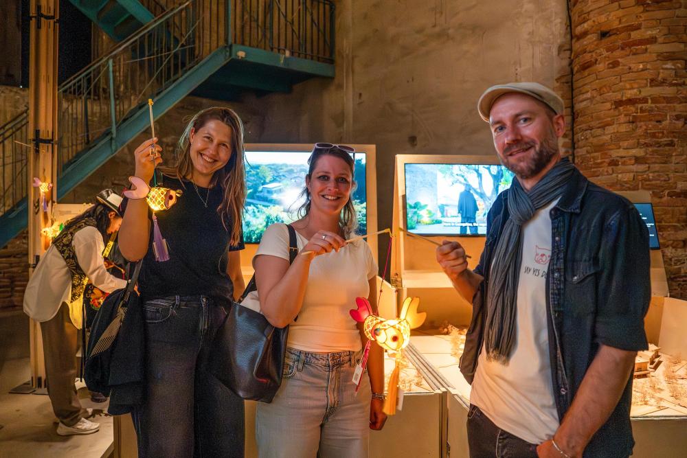 在意大利威尼斯,參觀者在第19屆威尼斯國際建築雙年展主題館“塱頭實驗”展區展示現場領取的嶺南魚燈紀念品(2025年5月10日攝)。