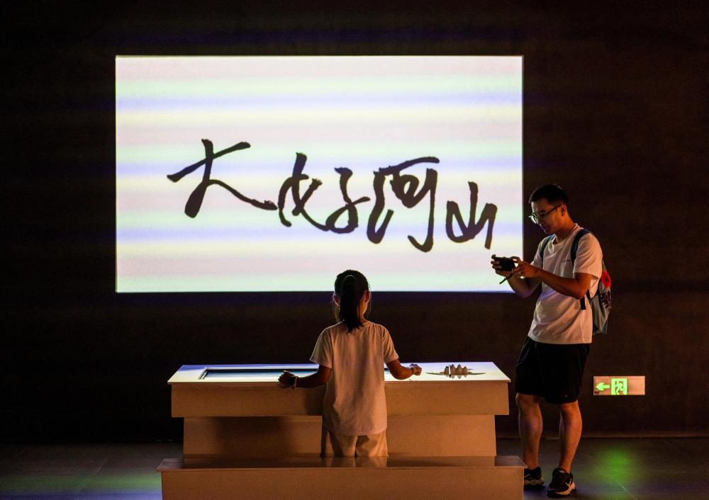 9月13日,遊客帶孩子在塱頭村的春陽台藝文中心體驗書法互動裝置。