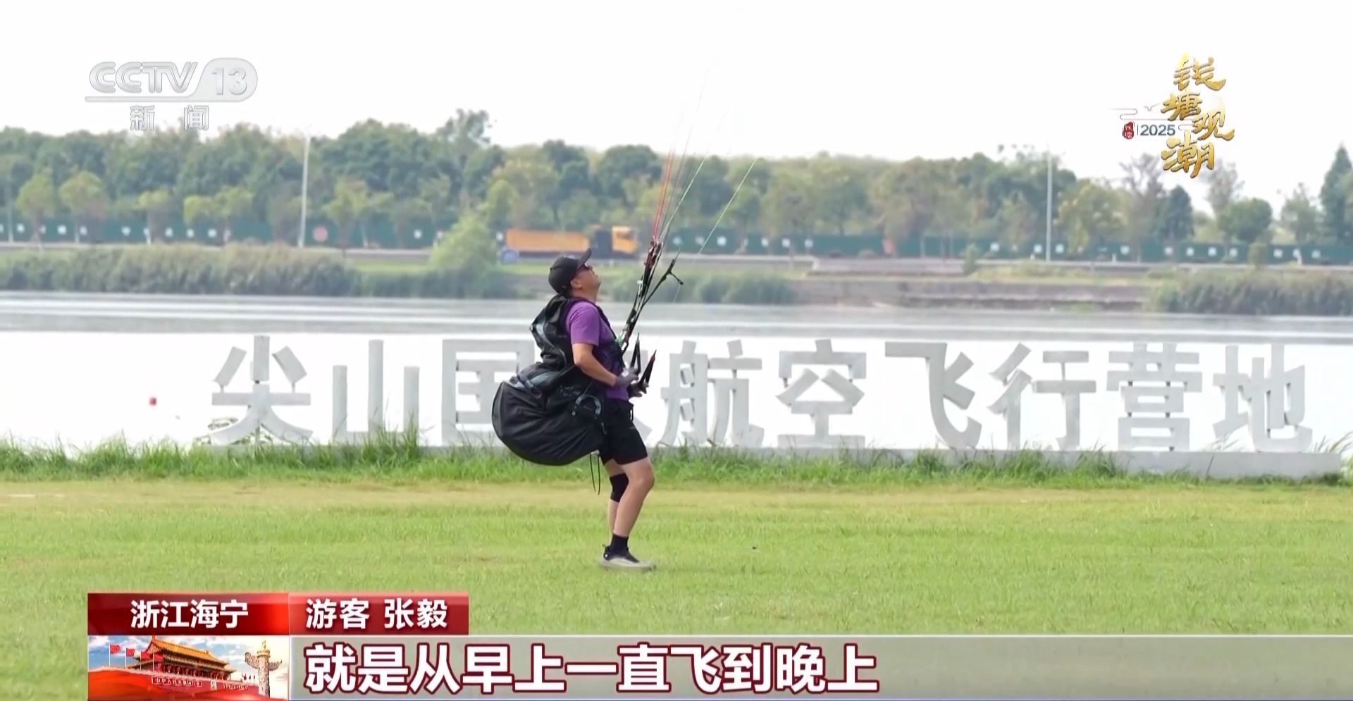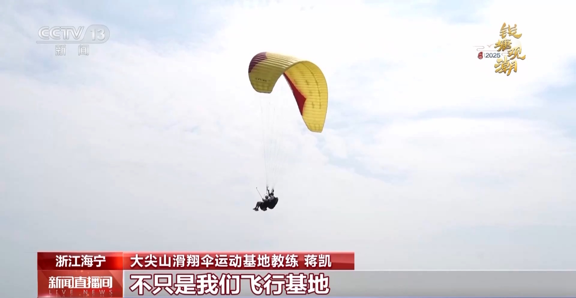 浙江海寧大尖山滑翔傘運動基地教練 蔣凱*:*潮水來的時候,我們的遊客量會增加。一般上海的、杭州的遊客比較多,每日的飛行大概在200次左右,不只是我們飛行基地,周邊的一些水上項目都會有很多的遊客。