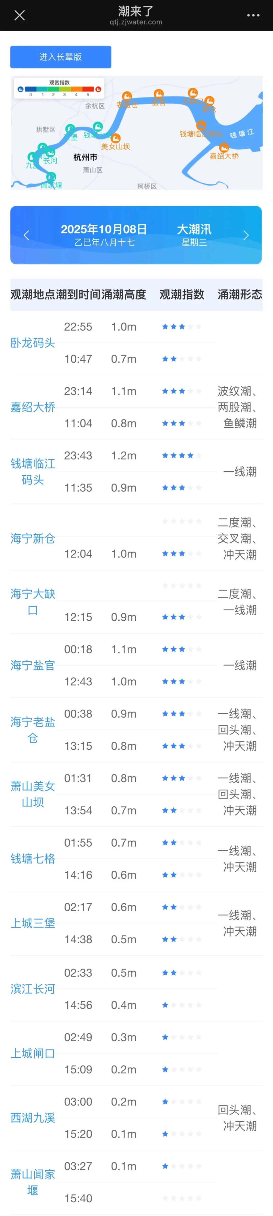注:1.潮到時間依次為夜潮、日潮時間,0點以後為次日時間。2.觀潮指數由低到高分為一星到五星,其中三星以下不推薦觀潮。