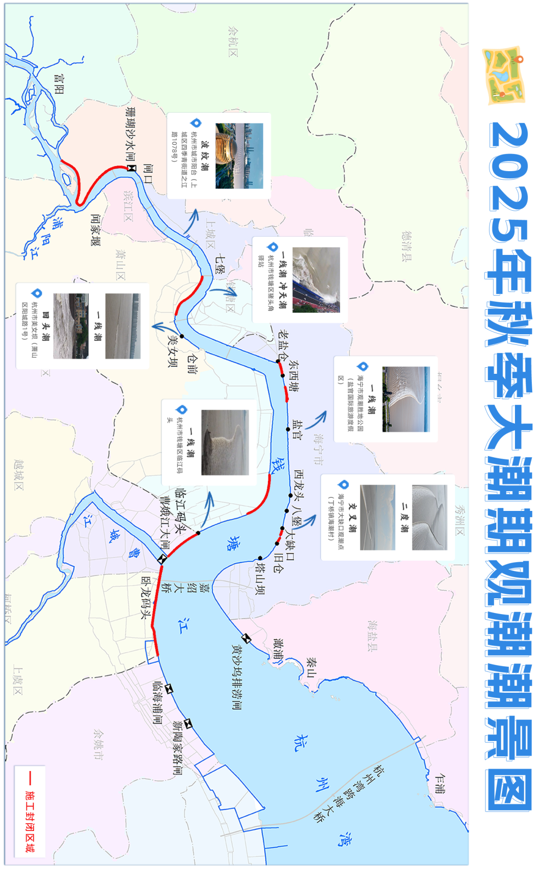 近期,錢塘江沿岸有多處施工工地,除上述推薦點位外,建議前往其他觀潮點的遊客提前核實開放信息,確保出行安全順利。