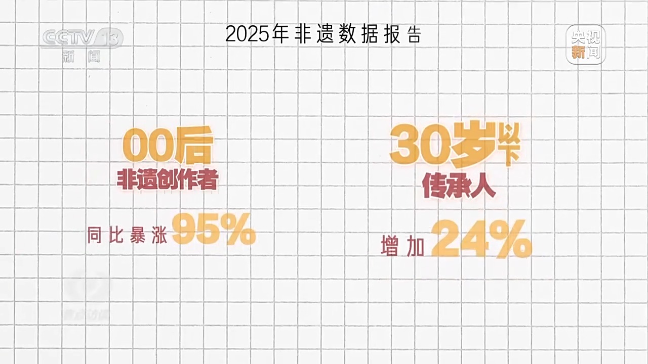 也許有人覺得這些故事太個別,所以我找到了某短視頻平台今年的非遺數據報告,也很能説明問題。報告中提到,一年來00後非遺創作者同比暴漲95%,30歲以下傳承人增加24%。越來越多年輕人主動扛起了傳承的擔子。為啥他們願意一頭扎進這些“老行當”?我找到了幾位新生代代表性傳承人,試着解開這份“偏愛”背後的密碼。