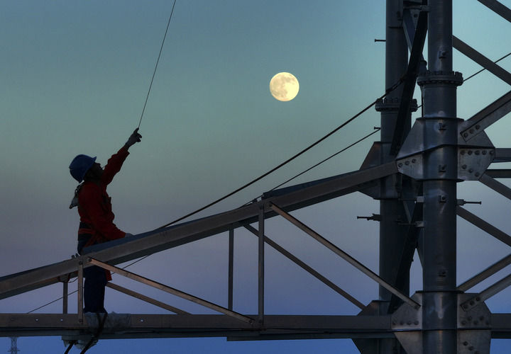 10月6日,在湖南省衡陽市雁峯區,高塔架線工人在月光的映射下施工(無人機照片)。新華社發(曹正平攝)