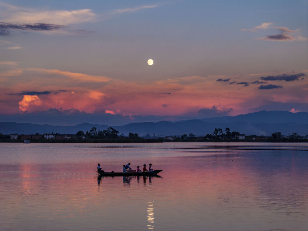 10月6日,人們乘船在雲南大理洱源西湖賞月(無人機照片)。新華社發(羅新才攝)
