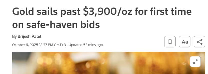 【環球網財經綜合報道】近段時間,金價持續攀升,引發市場廣泛關注,10月6日現貨黃金更是突破3900美元/盎司大關。到了10月7日,這股上漲熱潮仍未消退,截至發稿前,現貨黃金一度漲至3977.45美元/盎司,而同一日COMEX黃金期貨價格一度觸及4000美元/盎司,頻刷新歷史新高。
