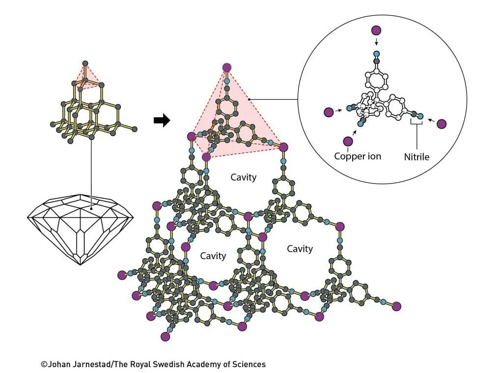 直到十多年後,他終於動手驗證這一想法。羅布森將帶正電的銅離子與四臂分子相結合,結果這些分子像鑽石晶格一樣自組裝成規則的三維晶體結構,不同的是,這種晶體內部竟有大量空腔。1989年,他在《美國化學會志》上發表成果,首次提出這類分子網絡的潛力,預言它們將賦予材料前所未有的性質。