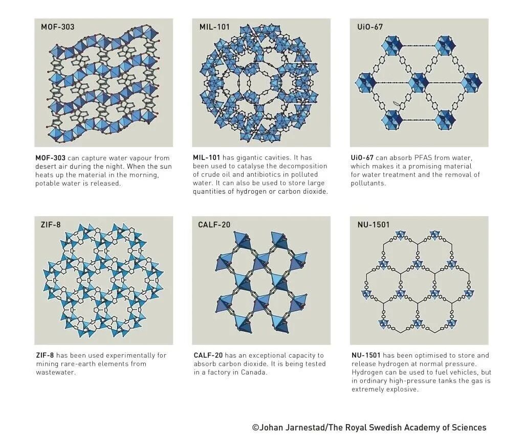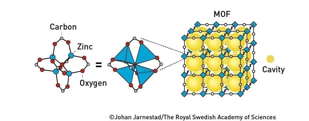 這種新型分子結構內部擁有大量空腔,分子可在其中自由進出。得益於三位科學家的工作,化學家如今已能設計出數以萬計的不同MOF,為化學領域帶來一連串“奇蹟”。
