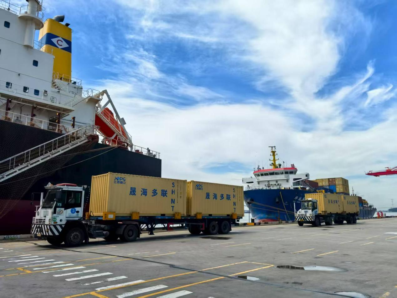 “傳統車皮運輸需多次倒裝,損耗率高、成本大。我們創新採用35噸敞頂箱替代車皮,鐵路直髮龍潭港後通過專用吊具直接拆箱裝船,全程貨物不落地、零損耗,每年節省物流成本近2000萬元。”晟海公司總經理管俊俊向記者介紹。