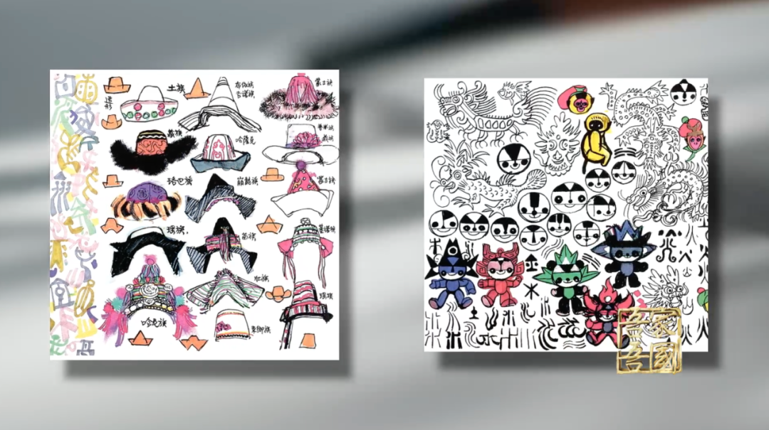 韓美林認為,應該創造出“融入中華民族文化的吉祥物”。他用上千個日夜打磨,在厚厚的畫冊裏設計了各種早期福娃形象,比如福娃的一頂帽子,他就畫了融合各民族元素的不同版本。