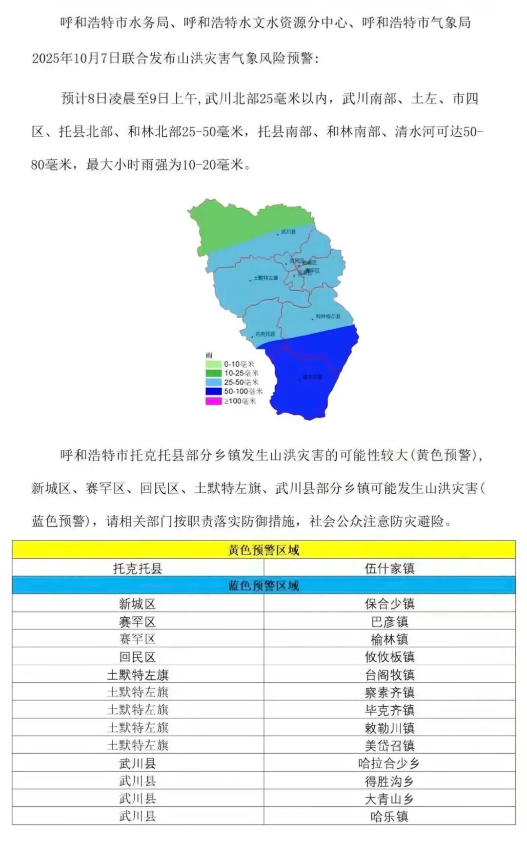 山洪災害預警 呼和浩特市中部部分地區有大雨 局地有暴雨