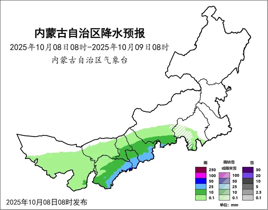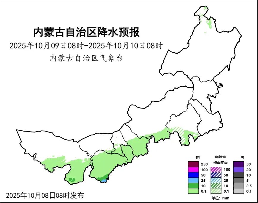 08日08時至09日08時,西部大部、中部偏西和偏南、東南部偏西地區多雲,有小雨或雨夾雪,其中,阿拉善盟東南部、巴彥淖爾市東南部部分地區、鄂爾多斯市大部、包頭市南部、呼和浩特市、烏蘭察布市大部、錫林郭勒盟南部、赤峯市西南部有中雨或雨夾雪,鄂爾多斯市東部、呼和浩特市中部部分地區和南部、烏蘭察布市南部、錫林郭勒盟西南部有大雨,局地有暴雨;西部偏南、中部偏西南地區氣温下降4到6℃,中部偏東北、東部偏西和偏北地區有霜凍或輕霜凍。