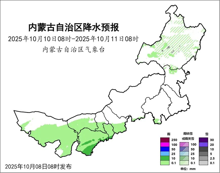 10日08時至11日08時,西部大部、中部偏南、東北部偏北地區多雲,有小雨、雨夾雪或小雪,其中,鄂爾多斯市南部、呼和浩特市西南部有中雨,呼倫貝爾市中部部分地區有中雪;西部沿山、中部偏東北、東部偏西和偏北地區有霜凍或輕霜凍。
