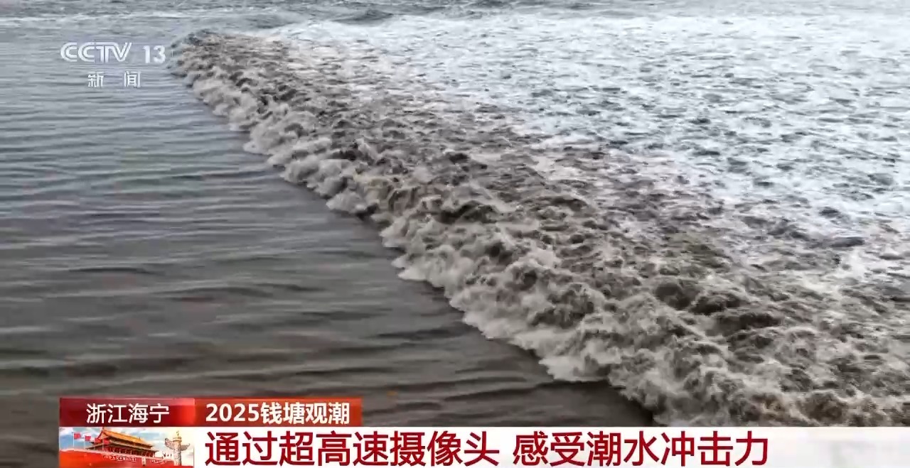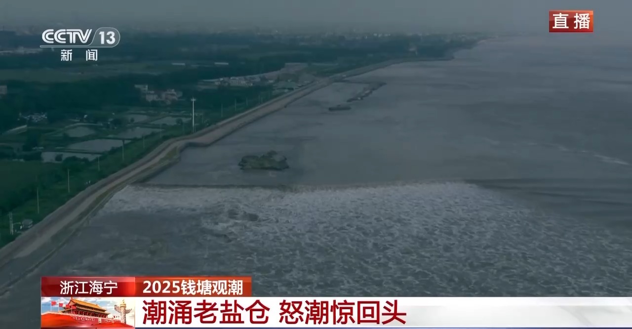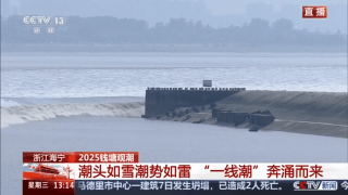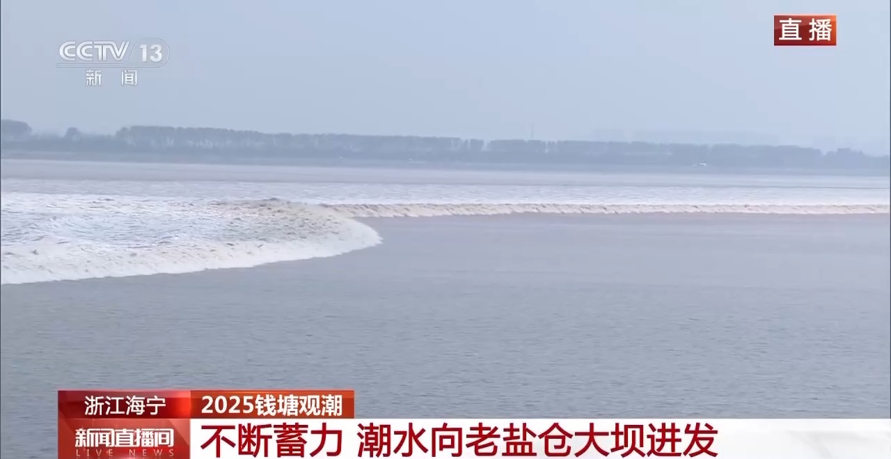 *總枱記者 彭雨佳:*我現在所在的位置是錢塘江的老鹽倉大壩。如果把潮水比做運動員,從起潮點到老鹽倉,它已經奔跑了50多公里。如果説前兩天我所在的塔山壩觀潮點,潮水是剛剛開始蓄力起跑。在老鹽倉的位置,潮水可以説是進入了最具爆發力的階段。