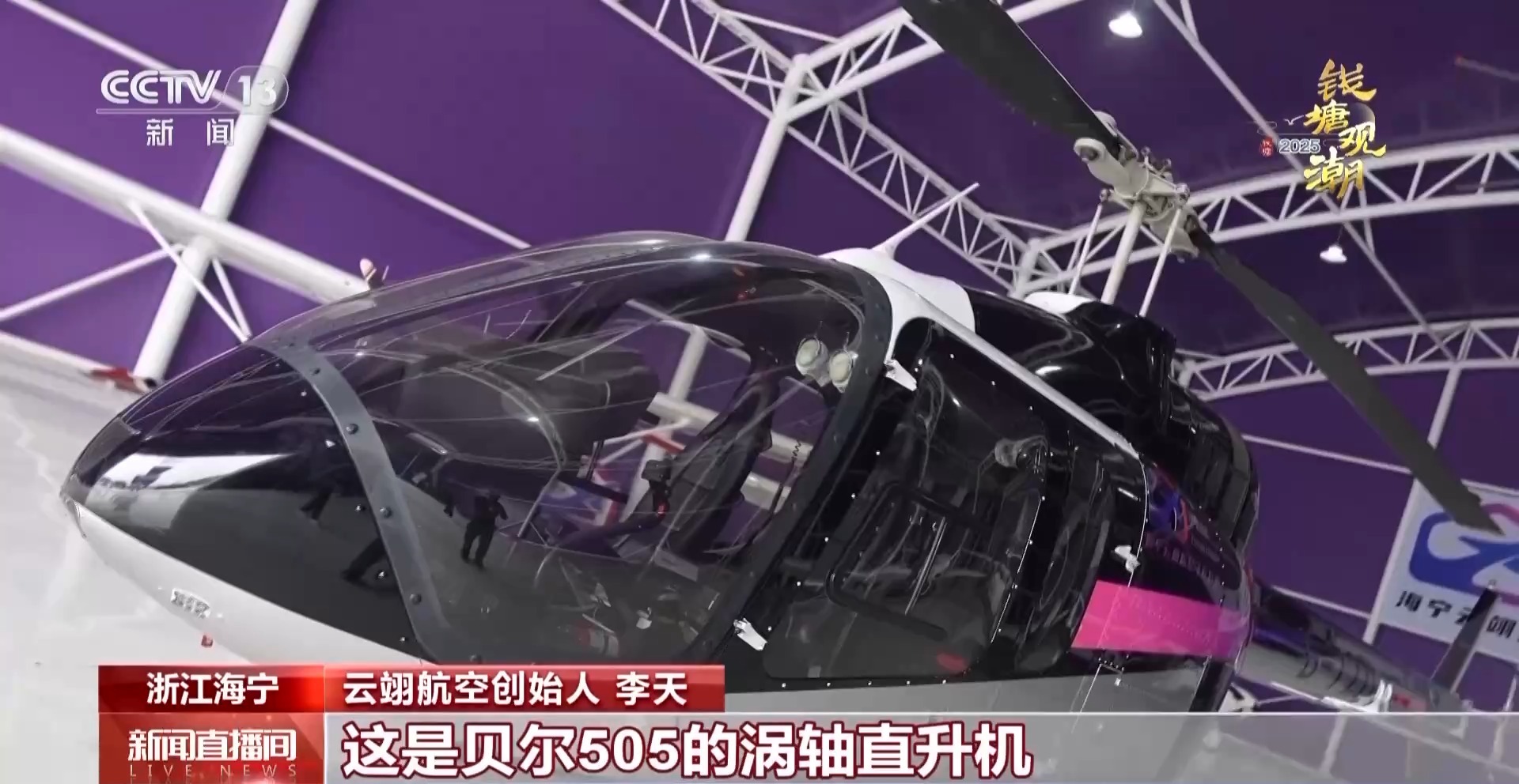 雲翊航空創始人 李天*:*這是貝爾505渦軸直升機。因為我們在錢塘江面上進行飛行,所以我們有應急浮筒,這個是比較少見的。如果有什麼特情,就能漂在江面上。這兩架飛機都是國產的。
