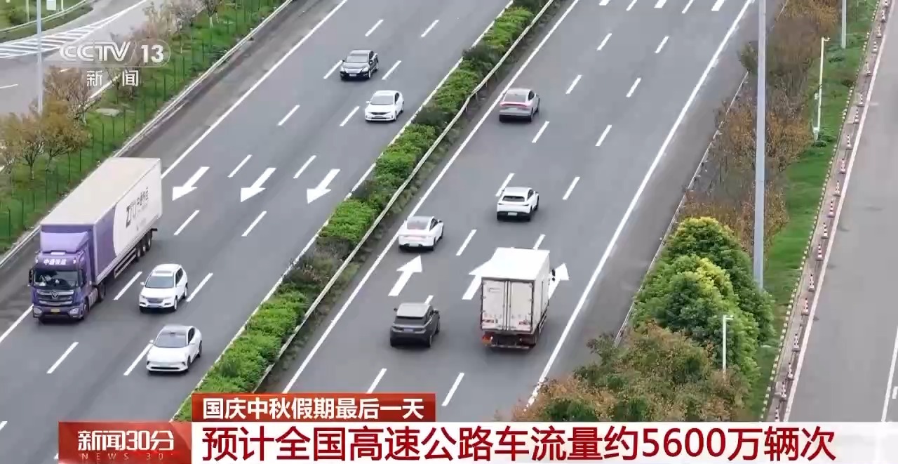 假期最後一天,全國公路路網流量以中長途返程和部分短途返程車流為主,車流量較昨日有所回落,預計全國高速公路車流量約5600萬輛次。