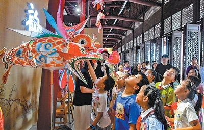 10月1日,浙江省金華市非遺館,遊客在欣賞浦江魚燈。