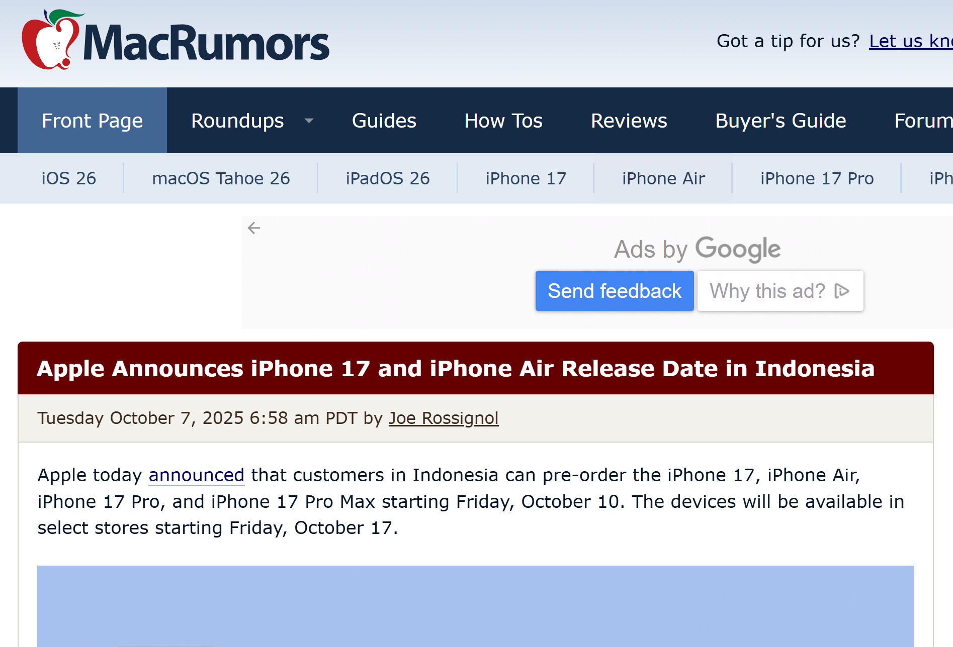 【環球網科技綜合報道】10月8日消息,據MacRumors報道,蘋果公司近日宣佈,將於10月10日(本週五)在印度尼西亞正式開啓iPhone 17、iPhone Air、iPhone 17 Pro及iPhone 17 Pro Max四款產品的預訂通道,並計劃於10月17日(下週五)通過當地授權經銷商啓動線下發售,標誌着蘋果進一步拓展東南亞市場的戰略落地。