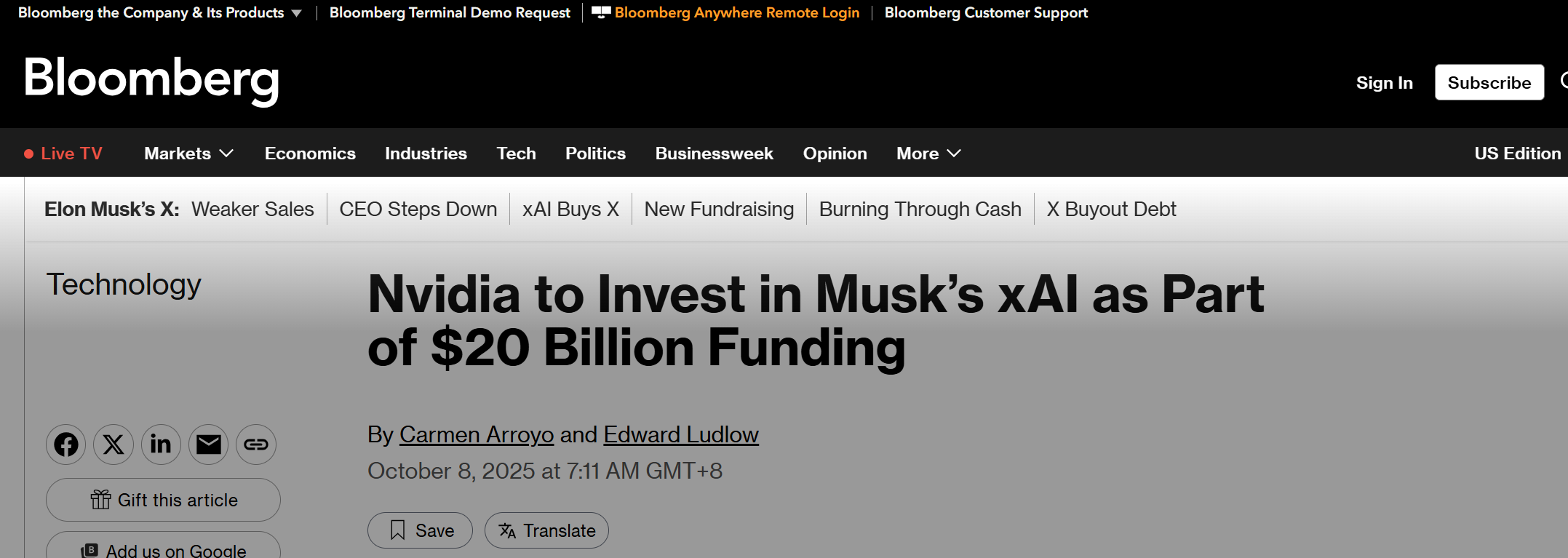 【環球網科技綜合報道】10月8日消息,據彭博社報道,近日有知情人士透露,由埃隆·馬斯克支持的人工智能初創企業xAI,正推進一輪規模超最初計劃的融資,芯片巨頭英偉達將以股權投資形式參與其中。此次融資完成後,xAI本輪持續進行中的融資總額有望達到200億美元(按當前匯率計算,約合1426.79億元人民幣),為其人工智能基礎設施建設注入重要動力。