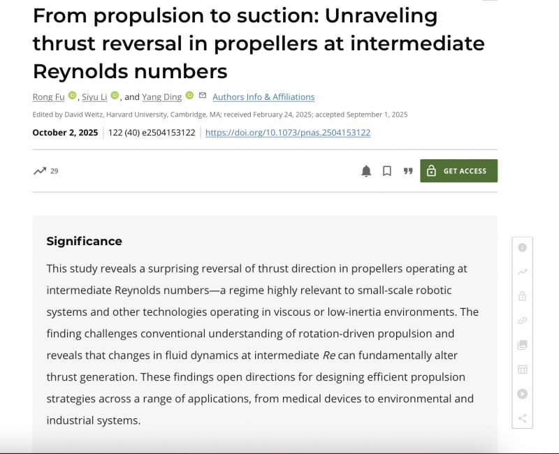 近日,北京郵電大學丁陽教授及團隊在《美國國家科學院院刊》(PNAS)發表重磅成果,首次發現螺旋槳推進系統的“推進力反轉”現象——特定場景下,無論螺旋槳正轉、反轉,物體均會後退。該發現突破傳統推進流體動力學認知,為螺旋槳推進在醫療、環保等微型機器人實際應用中即將面臨的困境提出預警及可能的解決方案,相關論文已於北京時間10月3日上線。