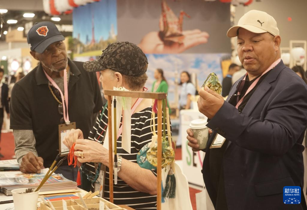 10月8日,在美國拉斯維加斯,參觀者在2025年美國國際會議與獎勵旅遊展的中國展區傾聽講解。 新華社發(曾慧攝)