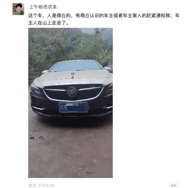 10月9日,知情人柯女士告訴大皖新聞記者,10月8日下午5點,她和朋友自駕前往新鄉南太行三疊瀑遊玩,在一家名為“上午峪老農家”的農家樂準備用餐時,發現門口停了一輛豫N牌照轎車,“農家樂老闆説車主一個人上山去了,沒有帶吃的,去了快兩天,農家樂老闆已報警。”