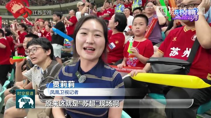 鳳凰衞視記者賈莉莉説:“我終於搶到‘蘇超’的門票了!‘蘇超’現場太激動人心了,專業級的賽場坐滿了球迷,加油聲、助威聲震耳欲聾。好鐘意江蘇,這裏好棒、好靚啊!”
