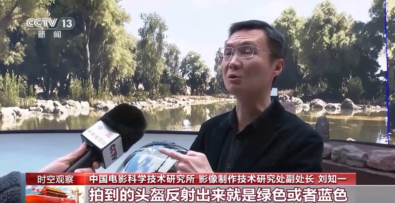 中國電影科學技術研究所 影像製作技術研究處副處長 劉知一:比如現在我要拍一個戴着頭盔在户外騎行的鏡頭,我們在傳統的綠幕或者藍幕拍攝的影棚裏面,拍到的頭盔反射出來就是綠色或者藍色,後期我們就需要一幀一幀處理掉,去替換成藍天白雲。在現在的虛擬影棚裏面,我們通過天幕投上去的藍天白雲的數字場景,大家可以看到我頭盔裏面反射的就是一個特別真實的藍天白雲,這樣就為我們後期大大節省了工作時間。