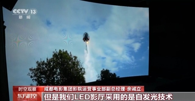 成都電影集團影院運營事業部副總經理 餘誠立:傳統的放映廳投射在銀幕上,它的畫面時常是中間亮,但是四周會比較暗。LED影廳採用的是自發光技術,它就像一個超大的電視機,沒有亮度損耗,因此任何一個角度去觀影,亮度都不會受到任何的影響,同時色彩的對比度、鮮豔度、飽和度都是傳統放映設備所不能比擬的。