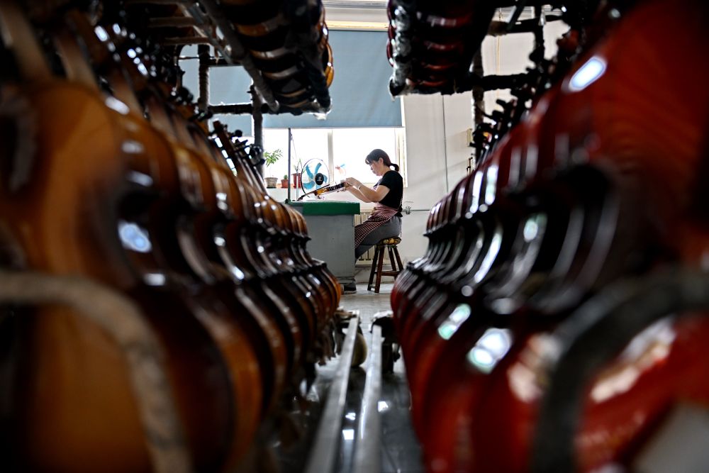 2025年5月28日,河北省武強縣一家樂器生產企業的工人在製作尤克里裏。武強縣樂器產業歷經30餘年的發展,形成擁有超過150家企業、從業人員萬餘人的產業集羣,產品覆蓋100多個品種、400多種規格。近年來,武強縣依託樂器文化產業資源,打造集樂器加工、樂器體驗、音樂展演和休閒度假等業態為一體的周窩音樂小鎮,同時創新“樂器+”鄉村振興模式,持續增強樂器產業的富民強縣作用。2024年武強縣樂器產業實現營收23.8億元,旅遊收入超10億元。