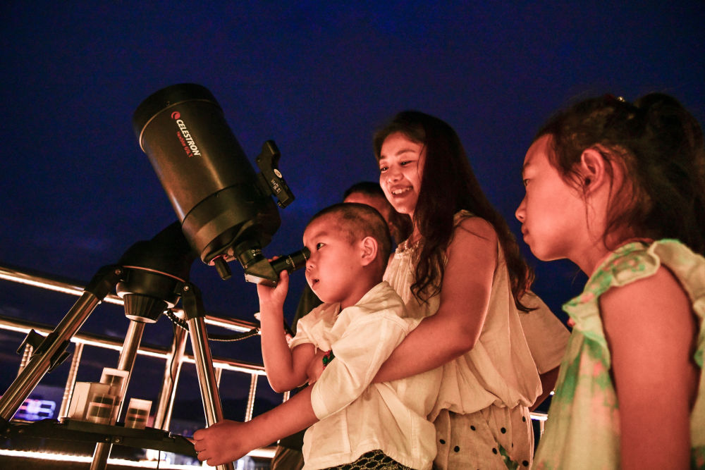 2025年7月9日,遊客在貴州省平塘縣克度“天文小鎮”通過望遠鏡觀測星空。近年來,隨着旅遊設施逐漸完善,距離“中國天眼”僅8公里的克度“天文小鎮”通過“科普+文旅”發展模式,帶動村民就業創業、增收致富。2025年1月至6月,“中國天眼”景區共接待遊客約38萬人次,總收入2496萬餘元。