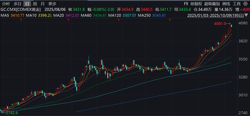 【環球網財經綜合報道】繼前一交易日突破4000美元整數關口之後,國際金價上週的步伐並未停滯。北京時間10月9日凌晨,COMEX黃金期貨漲1.40%報4060.60美元/盎司,COMEX白銀期貨漲1.95%報48.44美元/盎司。