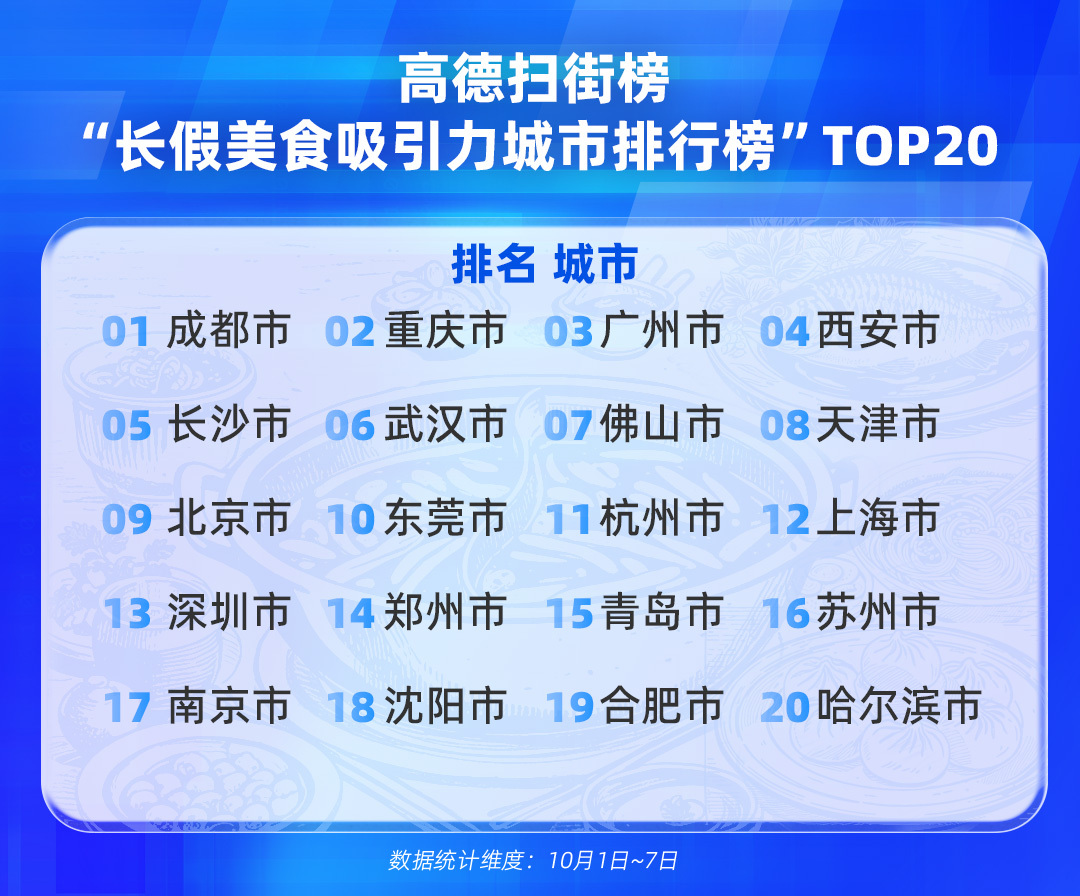 “好玩又好吃”成為廣大遊客出行決策的新標準,“美食+美景”讓更多人願意去、待得住。高德掃街榜數據顯示,全國《長假美食吸引力城市排行榜》的前20名依次是:成都、重慶、廣州、西安、長沙、武漢、佛山、天津、北京、東莞、杭州、上海、深圳、鄭州、青島、蘇州、南京、瀋陽、合肥、哈爾濱。