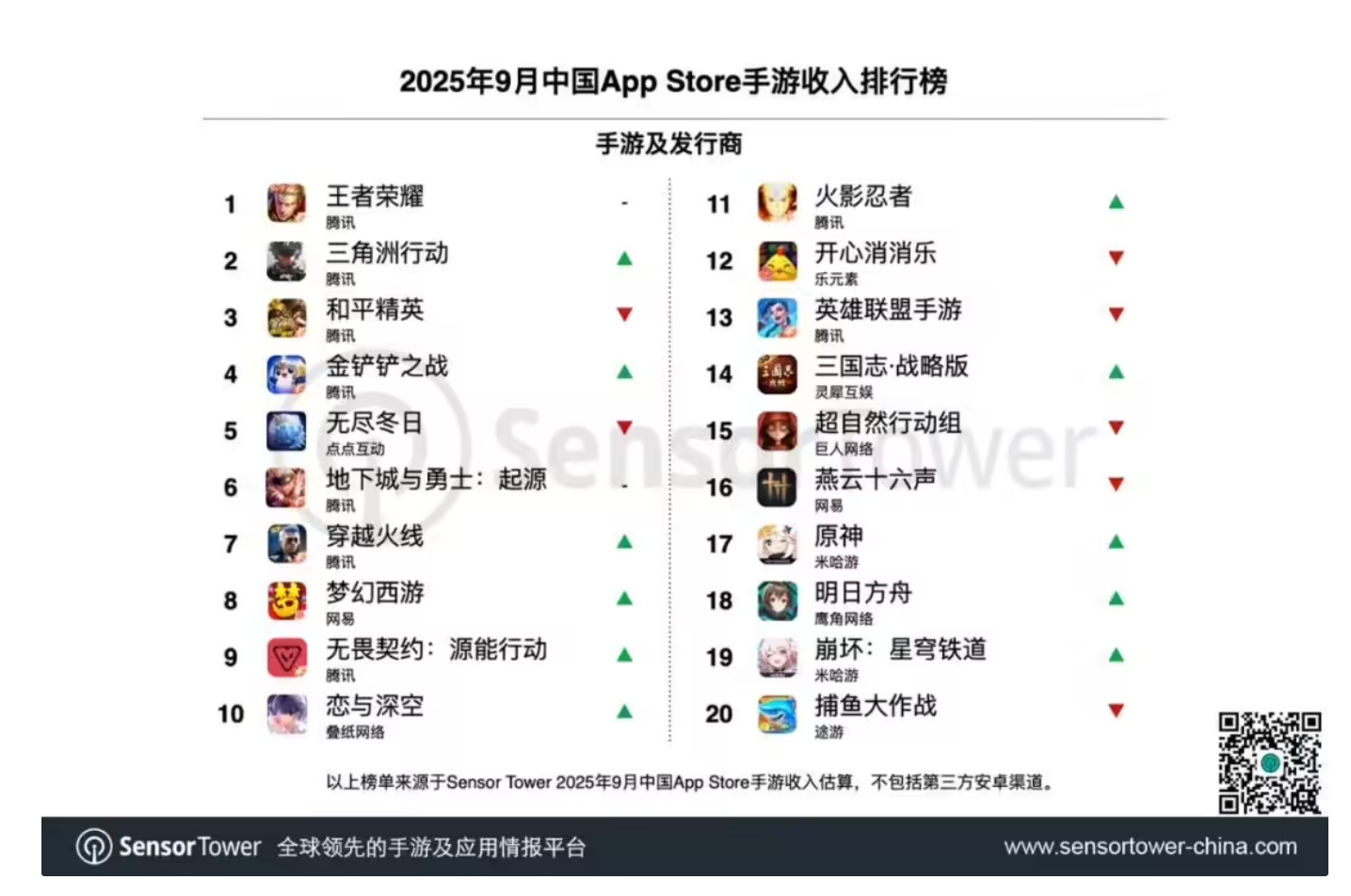 此外,騰訊旗下《王者榮耀》等四款手遊憑藉穩定的用户基礎與持續的內容運營,在9月中國App Store手遊收入榜單中表現突出,成功包攬榜單前四名,進一步彰顯了中國頭部手遊產品在國內市場的強大號召力。
