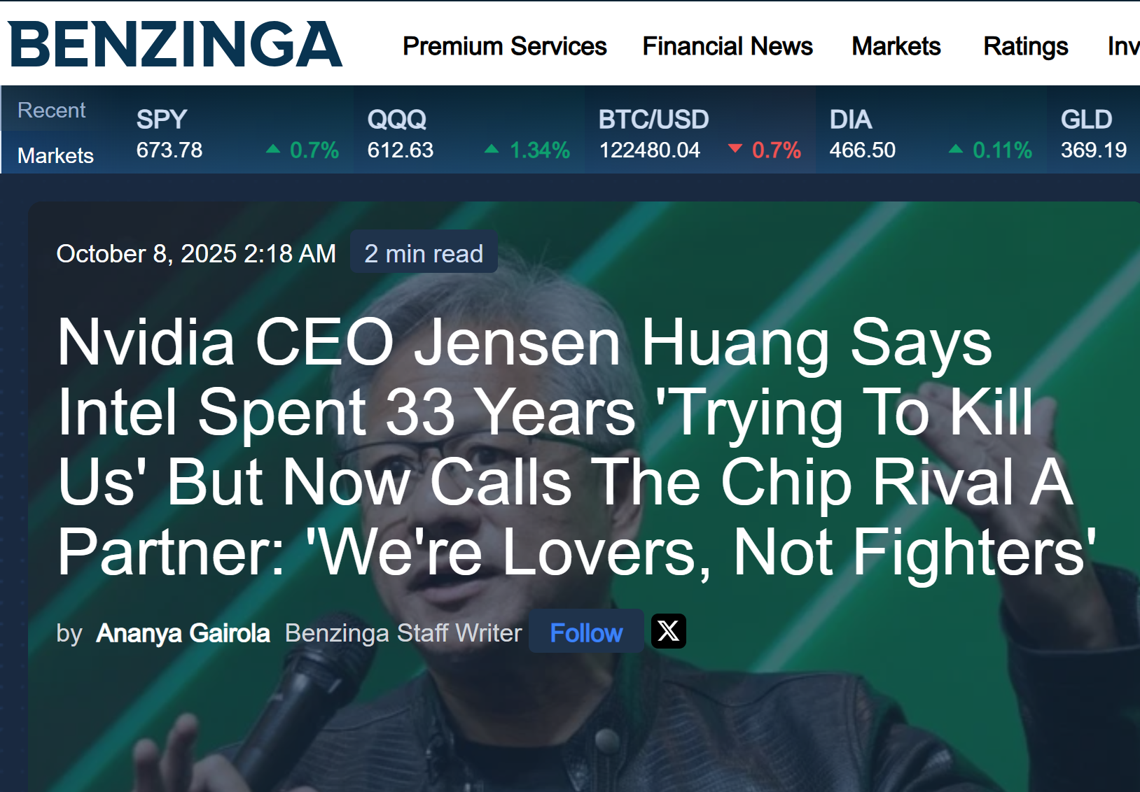【環球網科技綜合報道】10月9日消息,據Benzinga報道,英偉達CEO黃仁勳近日在一檔電視訪談節目中,回顧了英偉達與英特爾的競爭歷程,並重點談及雙方如今的戰略合作關係。