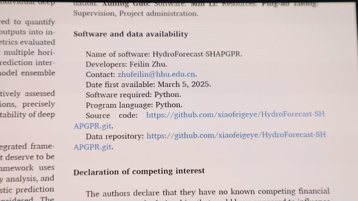朱非林在學術研究中有一個特別的堅持——公開分享自己的代碼。早在2017年,他就將防洪決策的模型代碼公開,美國、印度及國內的學者紛紛與他聯繫,在他開發的模型基礎上進行深化研究,推動了整個方向的發展。“水利行業是造福人民的事業,不應該有圍牆。“朱非林的想法很簡單,一項技術只有被更多人使用、檢驗和完善,才能發揮更大價值,更快推動整個行業進步。個人的工作如果能給其他研究者或工程單位帶來啓發和幫助,其意義就遠超一篇論文本身。